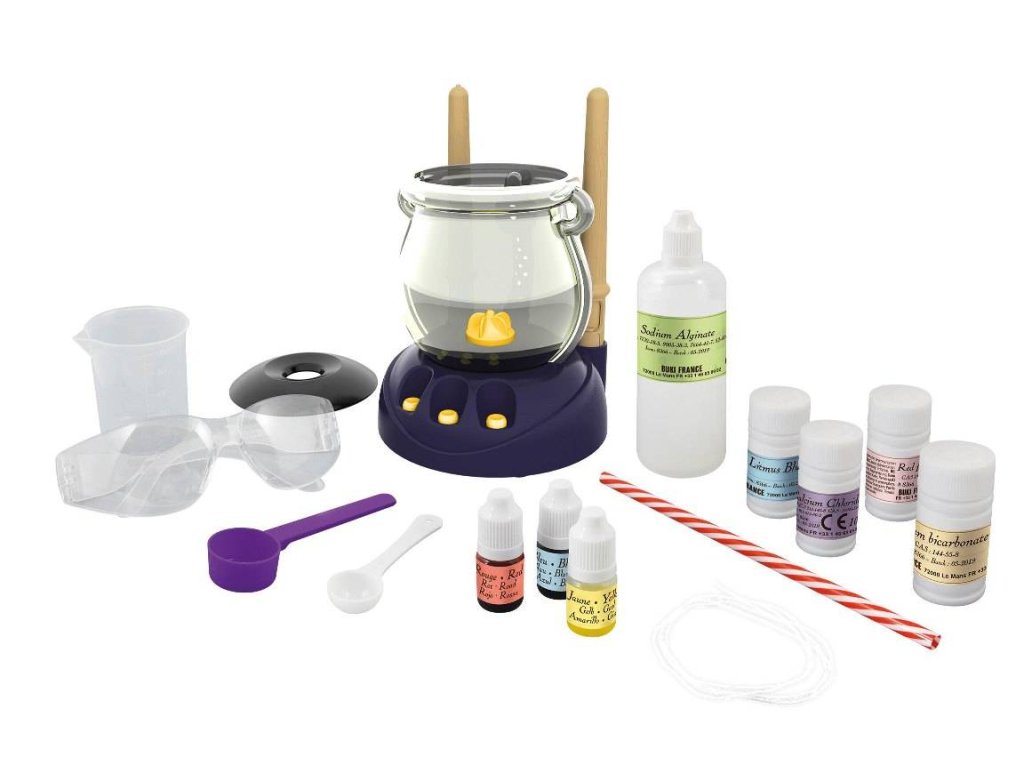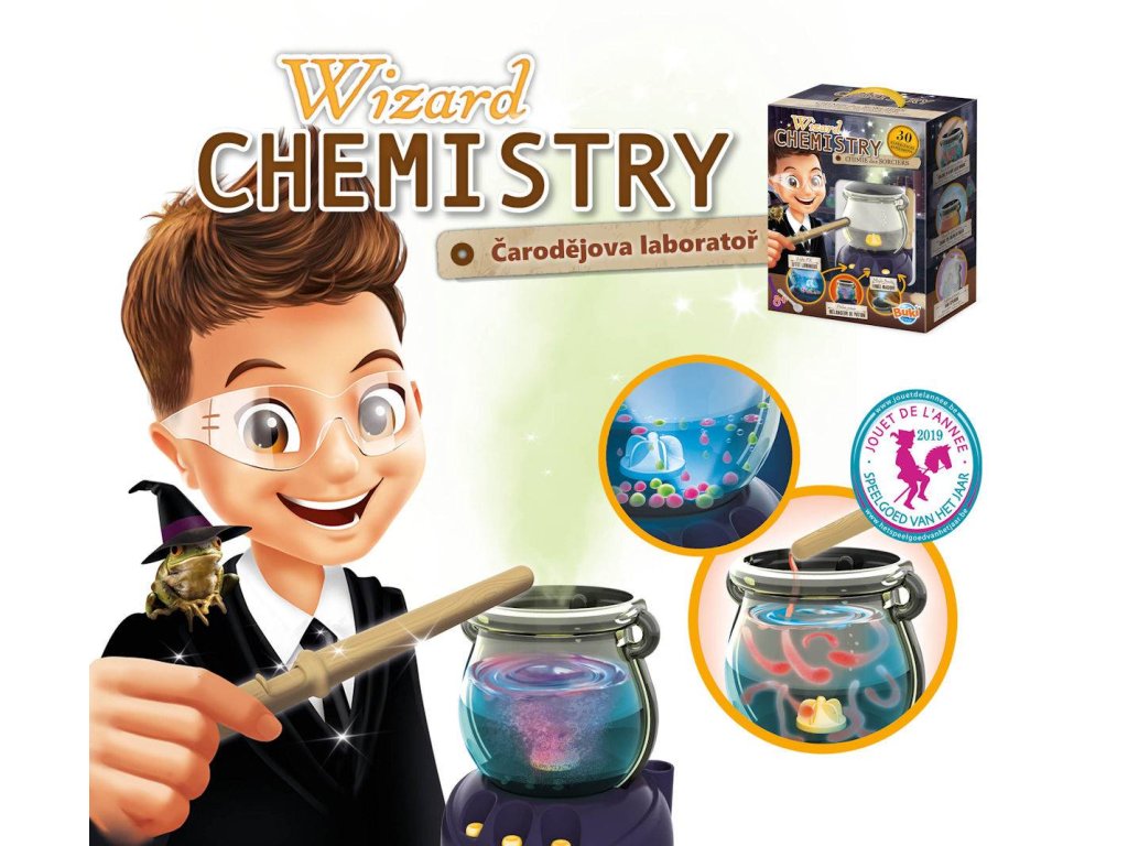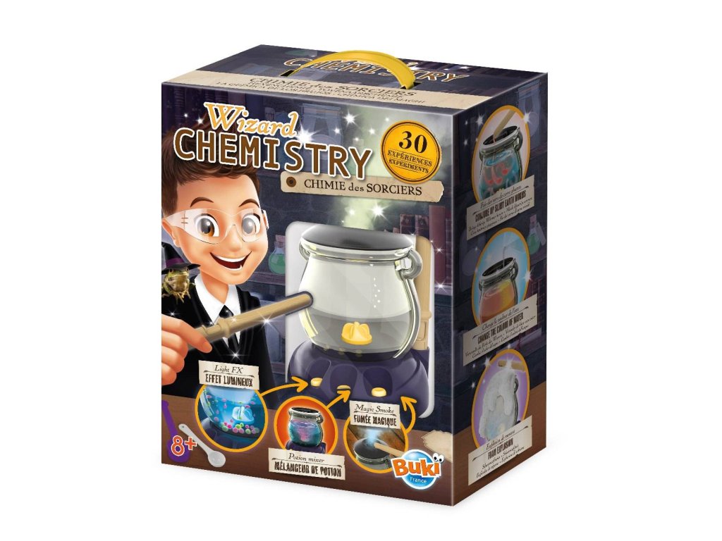 Čarodějova chemická laboratoř od BUKI je splněným snem každého malého vědátora. Sada je tématicky laděná jako dílna malého "chemického čaroděje" se všemi potřebnými pomůckami. Ústřední pomuckou je čarodějův kotlík, který slouží k míchání všemožných barevných lektvarů a sloučenin. Kotlík funguje jako mixér, takže není potřeba složitého míchání v kádinkách, navíc disponuje světelnými a u některých pokusů i kouřovými efekty.