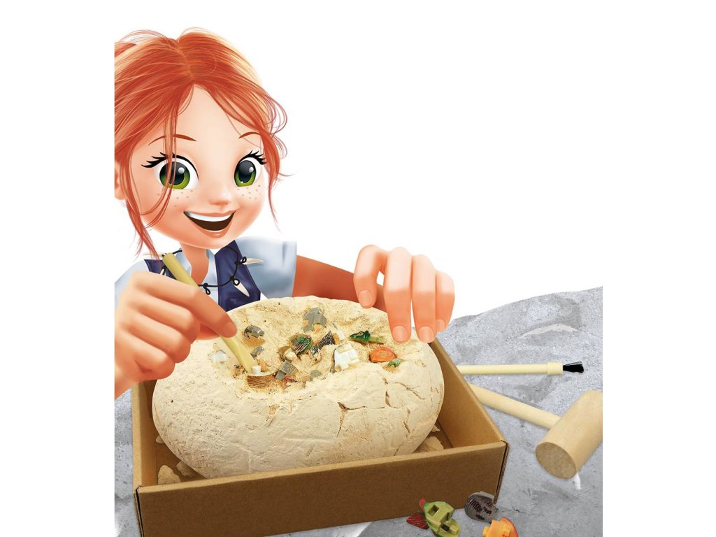 Použijte přiložené nástroje k "vykopání" 4 figurek dinosaurů z tohoto obřího (20cm) dinosauřího vejce... Tyranosaurus, Diplodocus, Stegosaurus, Styracosaurus. Krabička poslouží jako miska pro zachytání nepořádku. Po vykopání figurek je omyj a očisti pod vodou.