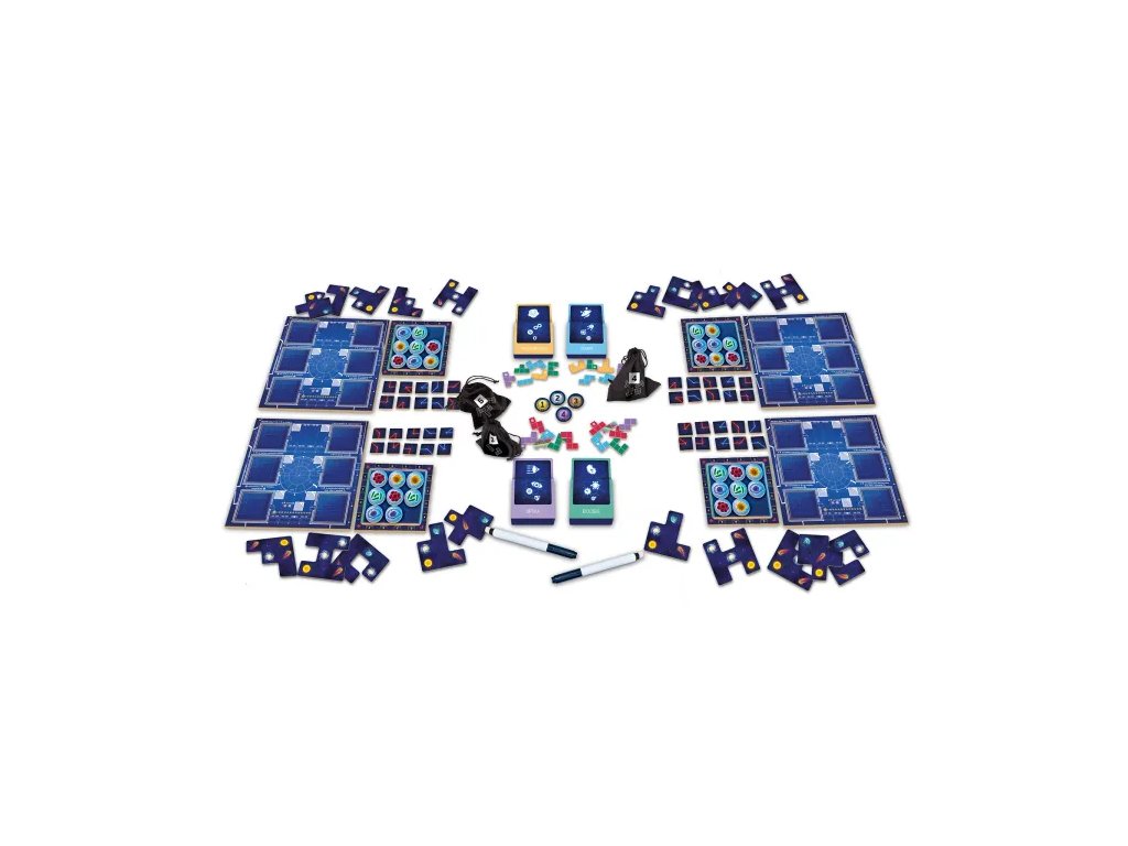 Hra obsahuje: 168 karet (160 karet úloh a 8 karet nápovědy), 4 tematické krabičky na 4 okruhy karet, 160 tetrisových dílků expozic, 4 sady žetonů hráče (10 žetonů laseru/robota, 8 žetonů s buňkami), 20 speciálních karet vesmíru, 3 plátěné pytlíky na dílky expozic, 4 desky hráče, 4 desky iQLANDIE, 4 žetony pořadí, 2 mazatelné fixy a pravidla.