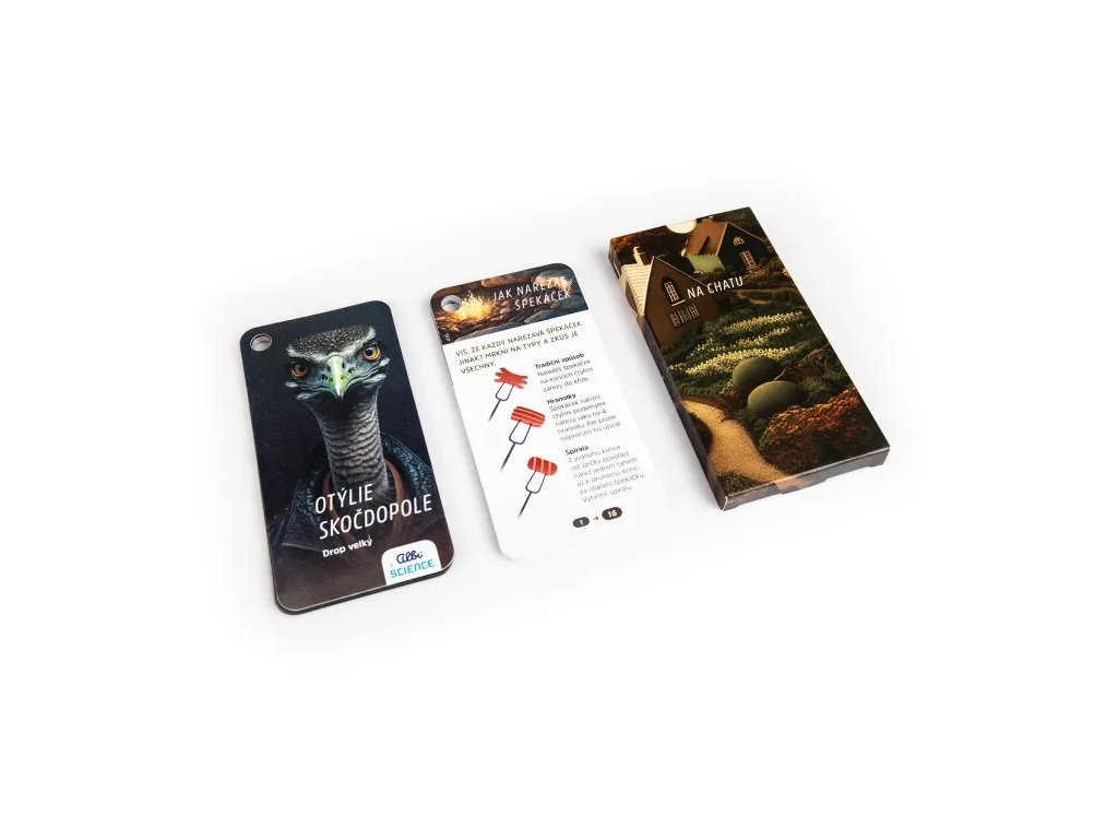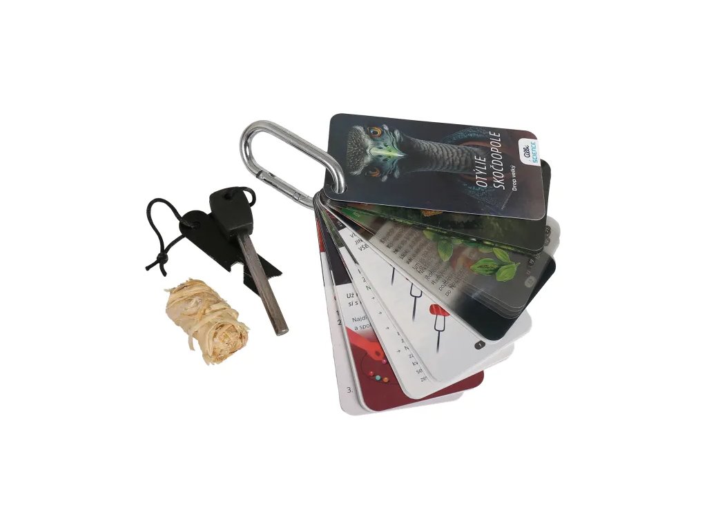 Krabička pravého dobrodruha - Na chatu obsahuje: ostrý skládací nůž, 30 plastových karet se zajímavostmi, karabinu na uchycení karet, návody, pravidla a tipy.