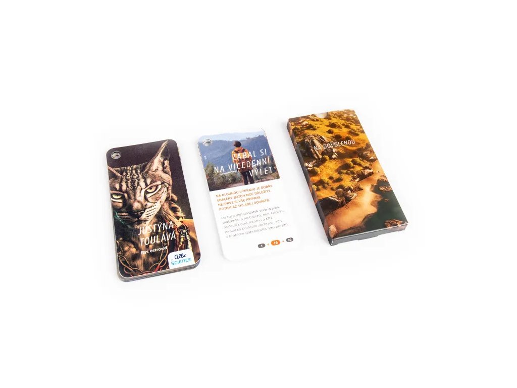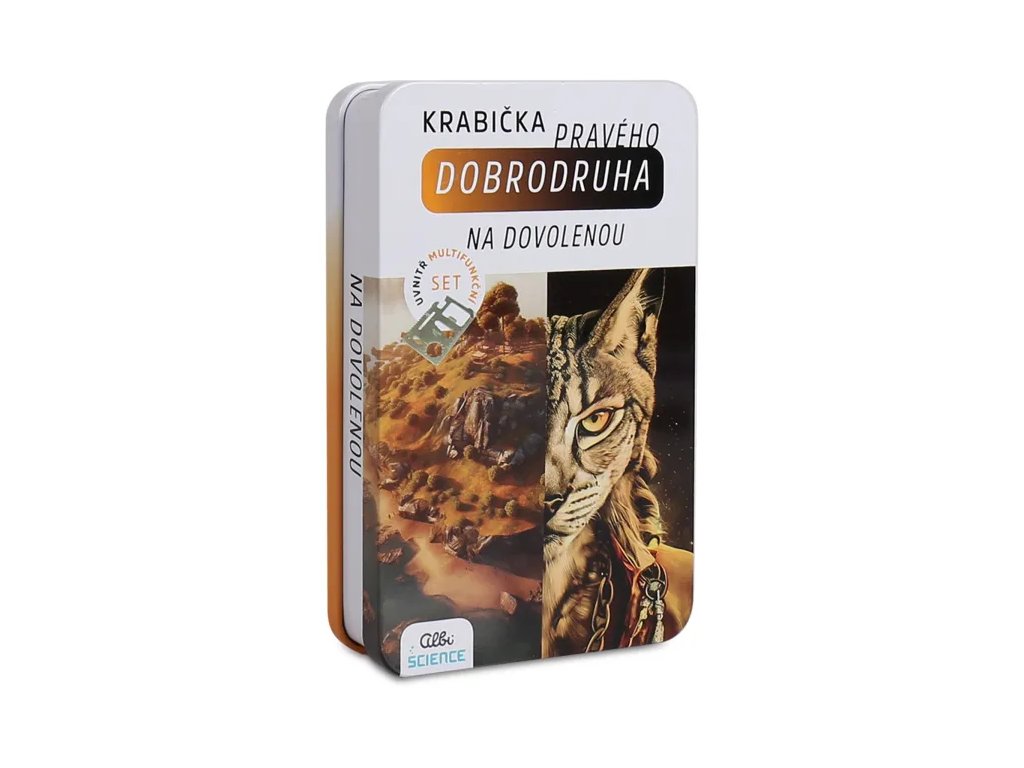 Krabička pravého dobrodruha - Na dovolenou obsahuje: multifunkční nástroj, pláštěnku, tužku, 30 plastových karet se zajímavostmi, karabinu na uchycení karet, návody, pravidla a tipy.