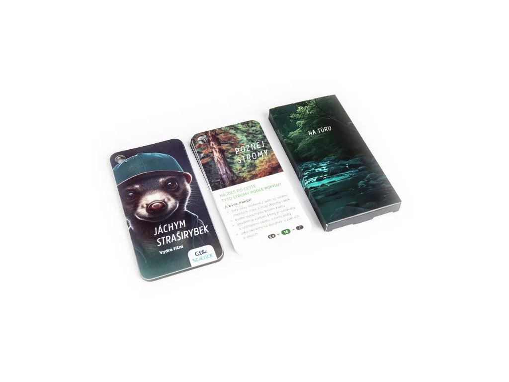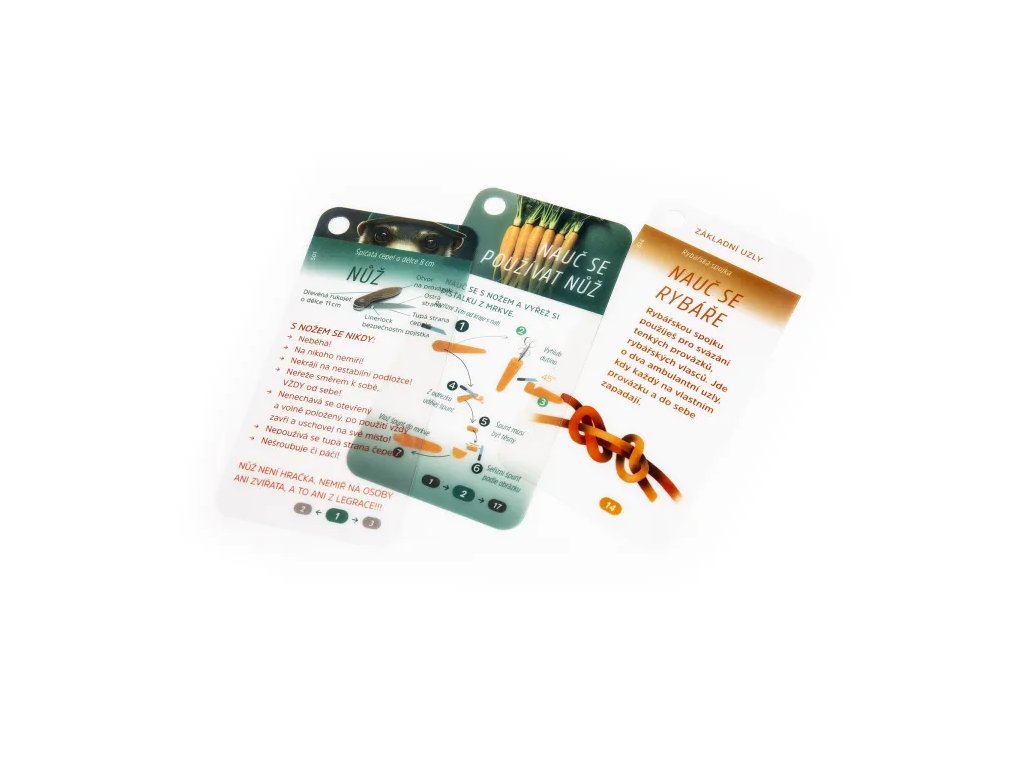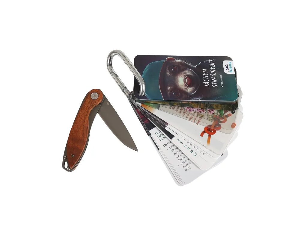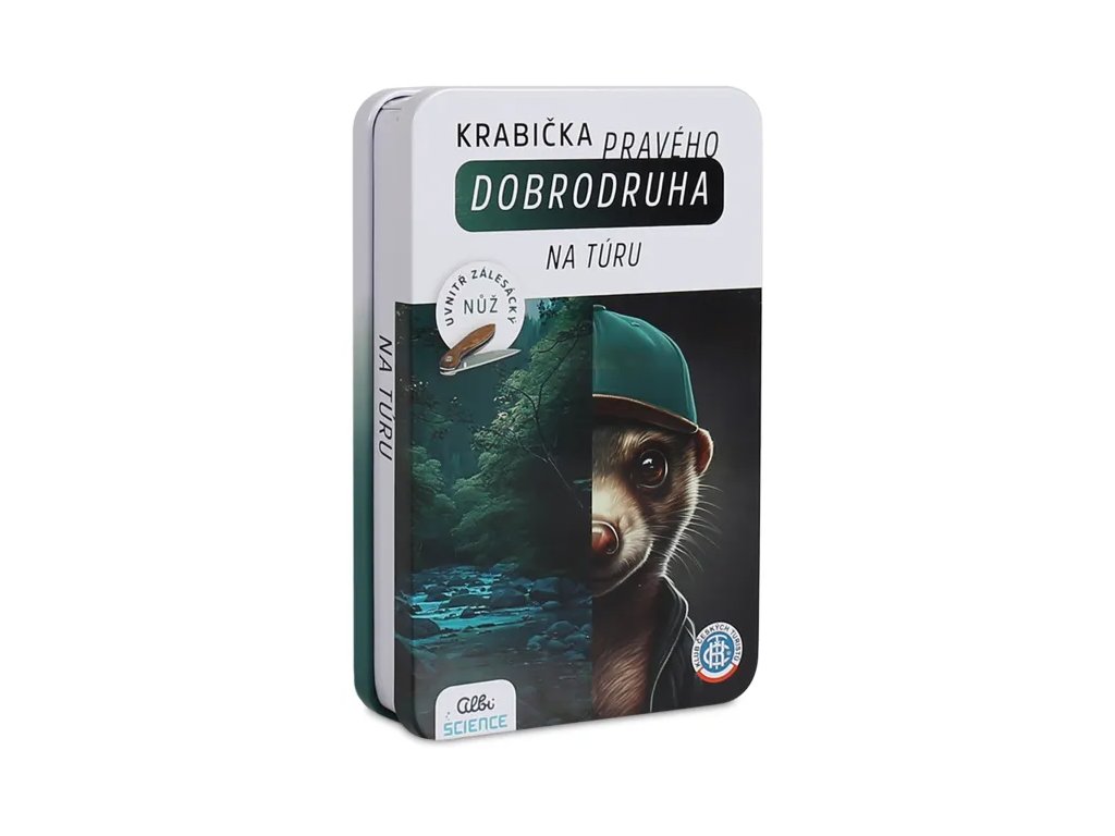 Krabička pravého dobrodruha - Na túru obsahuje: ostrý skládací nůž, 30 plastových karet se zajímavostmi, karabinu na uchycení karet, návody, pravidla a tipy.