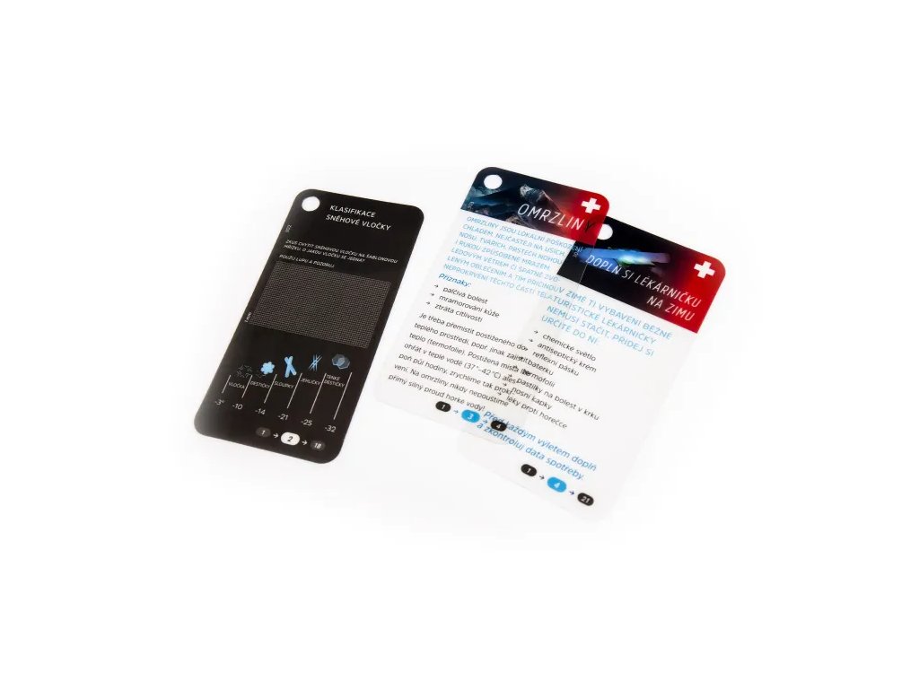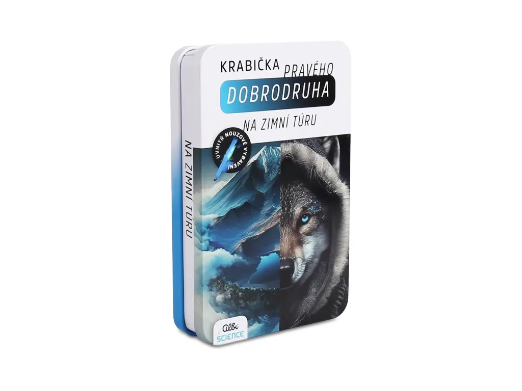 Krabička pravého dobrodruha - Na zimní túru obsahuje: 2 nouzová svítidla, reflexní pásek, termofólii, lupu, 30 plastových karet se zajímavostmi, karabinu na uchycení karet, návody, pravidla a tipy.