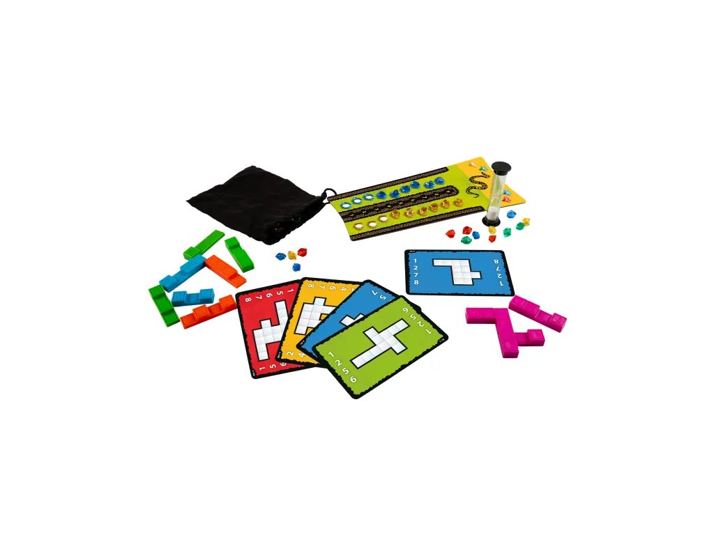 Rodinná hra Ubongo v nové variantě s obdélníkovými trojrozměrnými dílky, 324 zadáními a čtyřmi stupni obtížnosti.