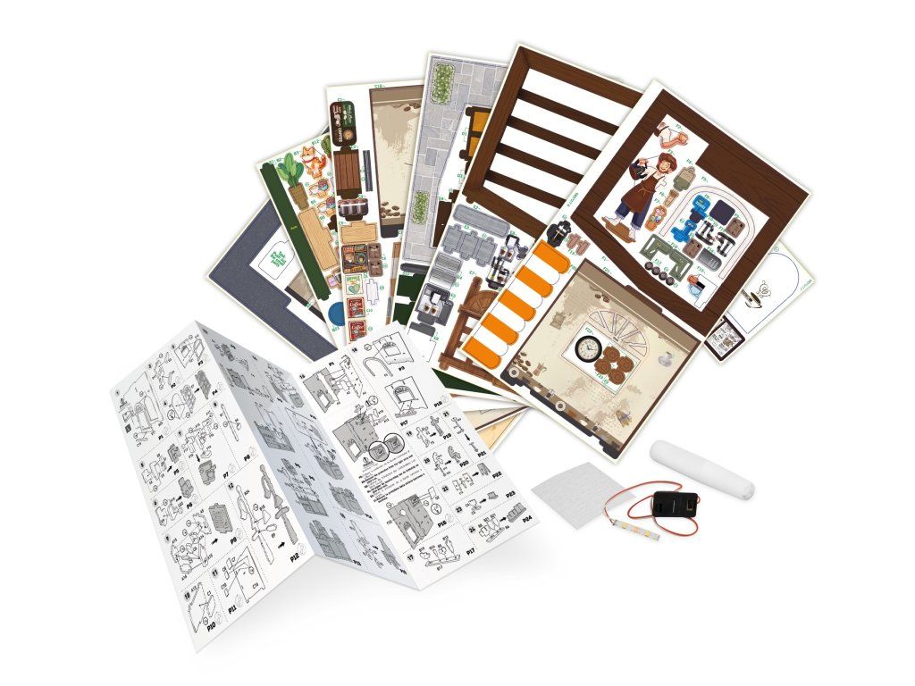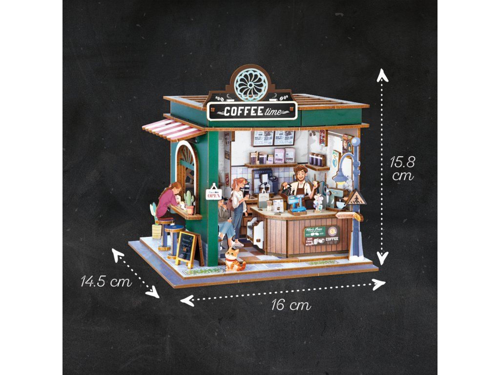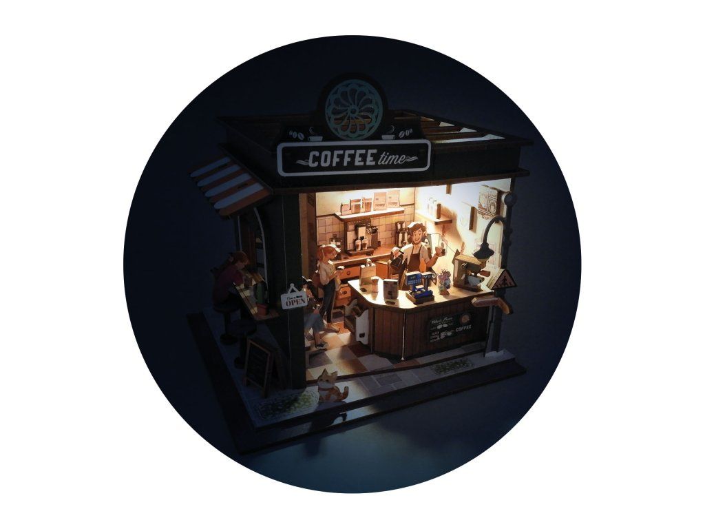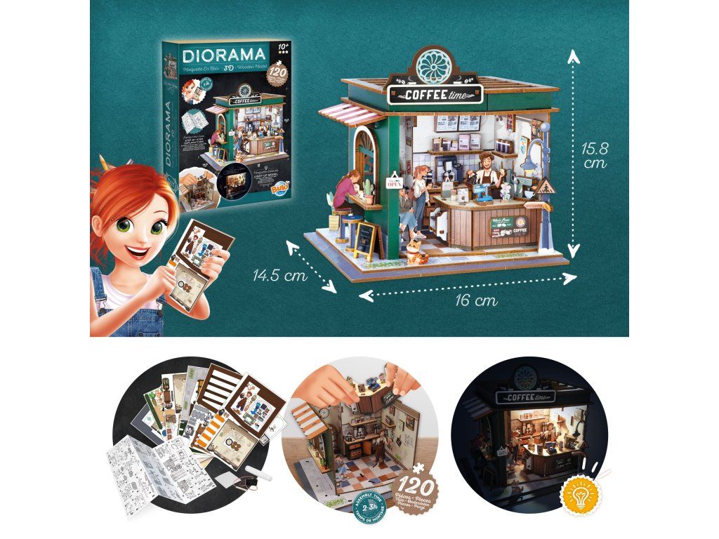 Populární série dřevěných stavebnic DIORAMA 3D s LED osvětlením. Sestavte si vlastní miniaturní kavárnu z více než 120 dílků s barevným potiskem.