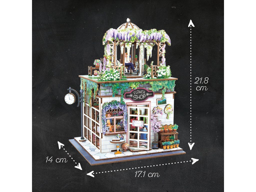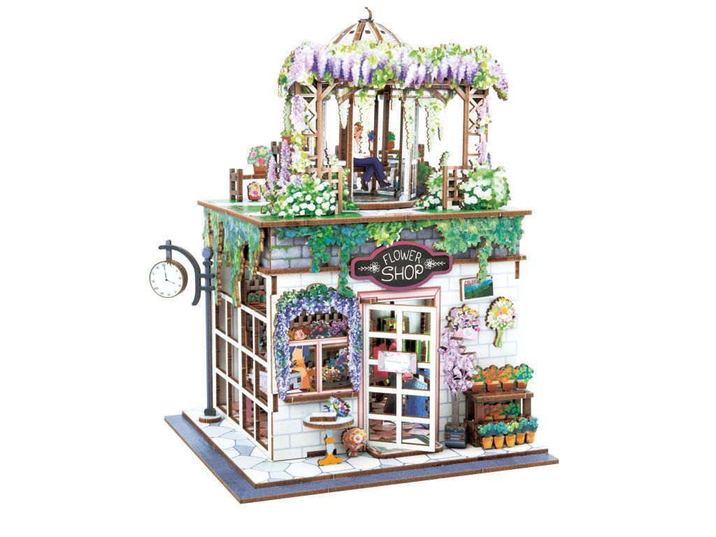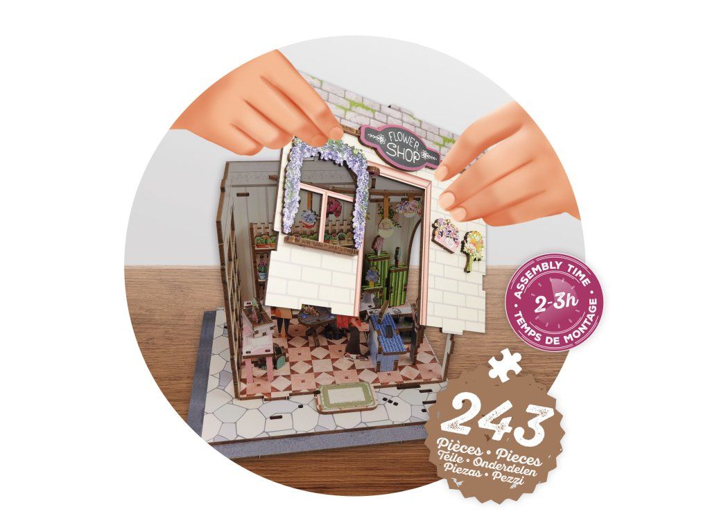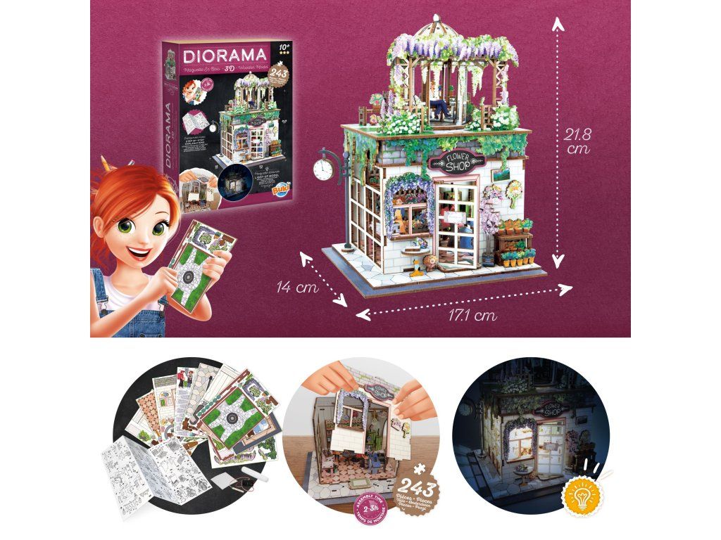 Populární série dřevěných stavebnic DIORAMA 3D s LED osvětlením. Sestavte si vlastní miniaturní květinářství z více než 243 dílků s barevným potiskem.