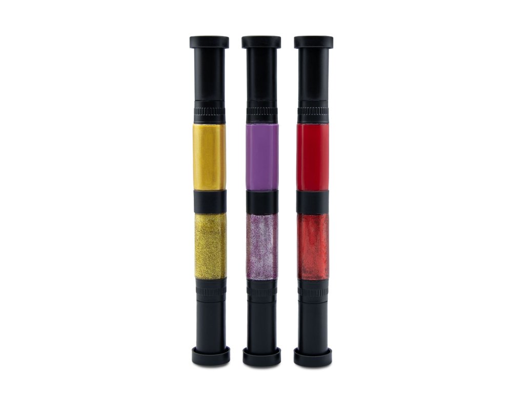 Krabička obsahuje tři pera se dvěma lahvičkami: červenou, zlatou a fialovou, standardní verzi a verzi s třpytkami. Každá lahvička má štětečkový a perový hrot.
