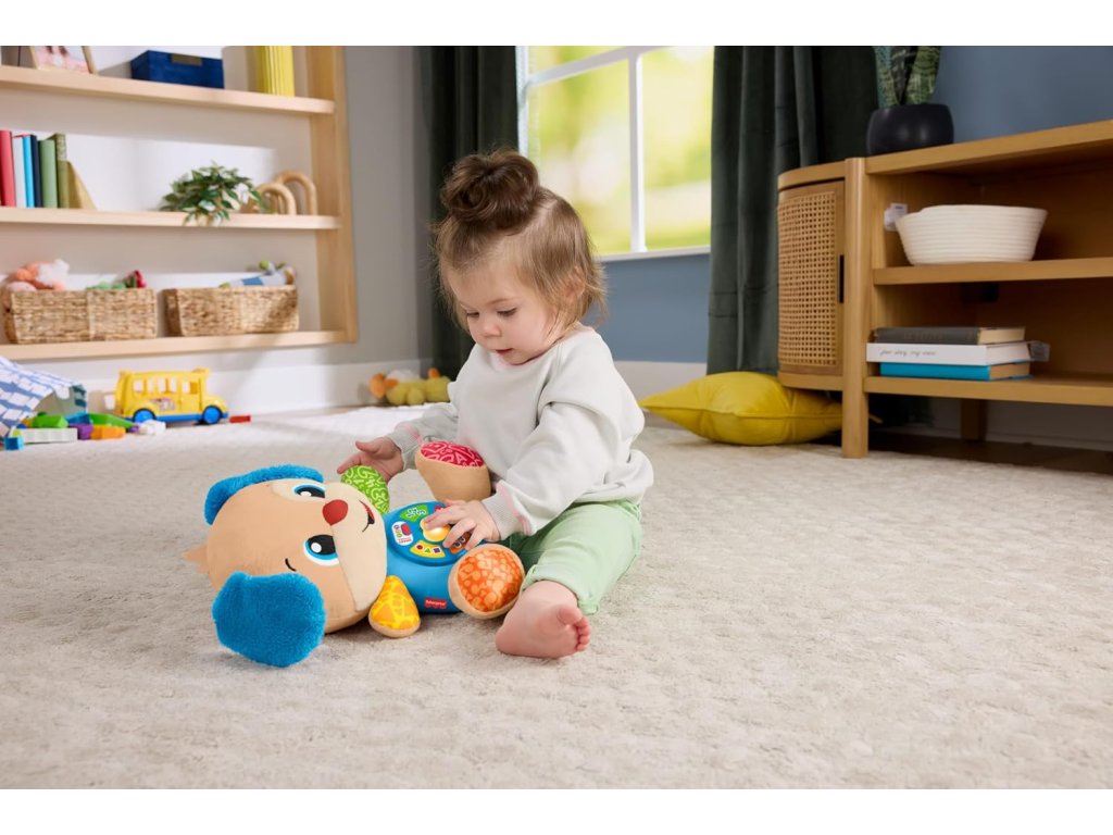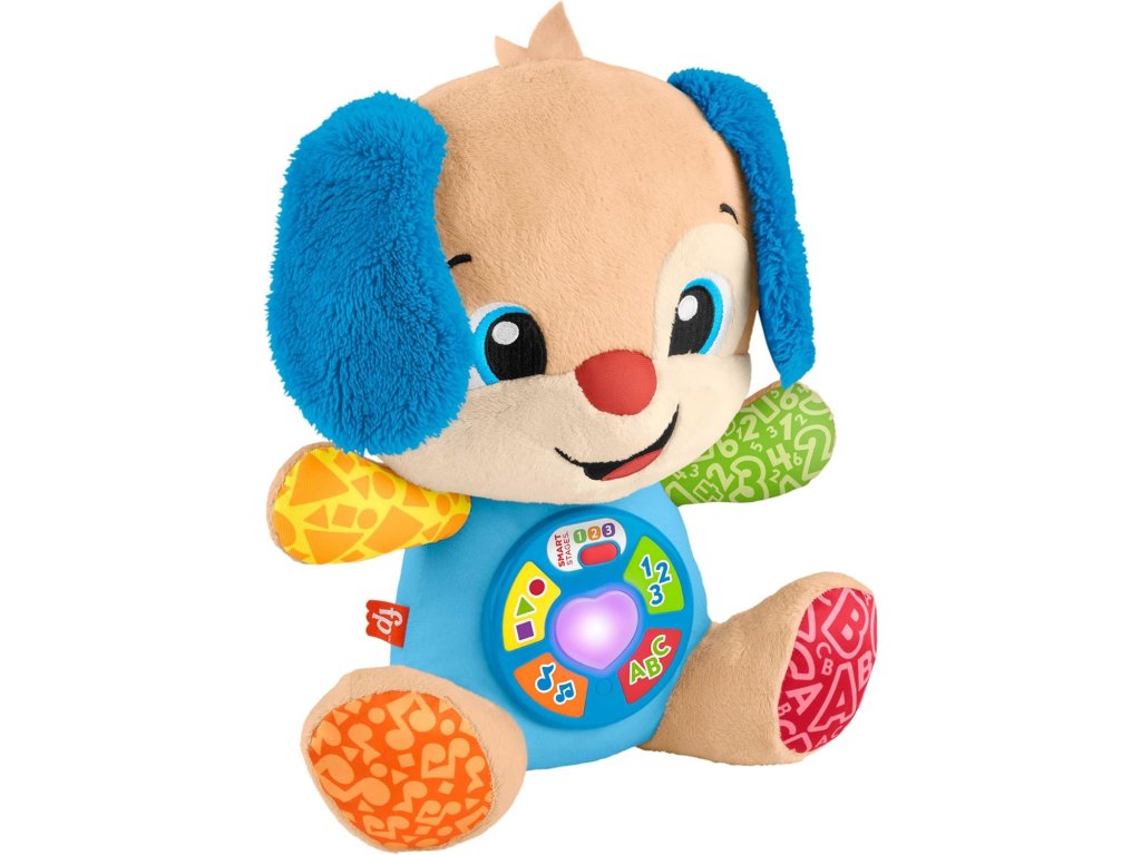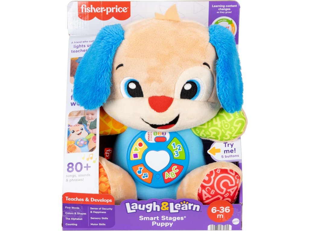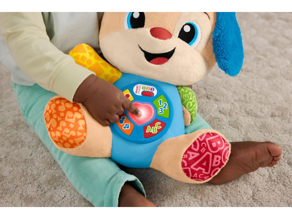 Mluvící pejsek Smart Stages® z řady Fisher-Price® Směj se a Poznávej!® je příjemná plyšová hudební hračka, která seznamuje děťátko s abecedou, tvary, prvními slovy a dalšími prvky! Děti mohou stisknout 5 tlačítek na bříšku pejska a sledovat, jak se jeho srdíčko rozsvěcuje různými barvami, zatímco hraje více než 80 písniček, zvuků a frází.