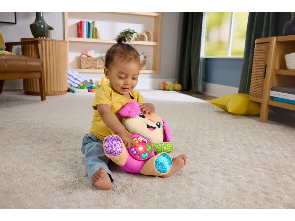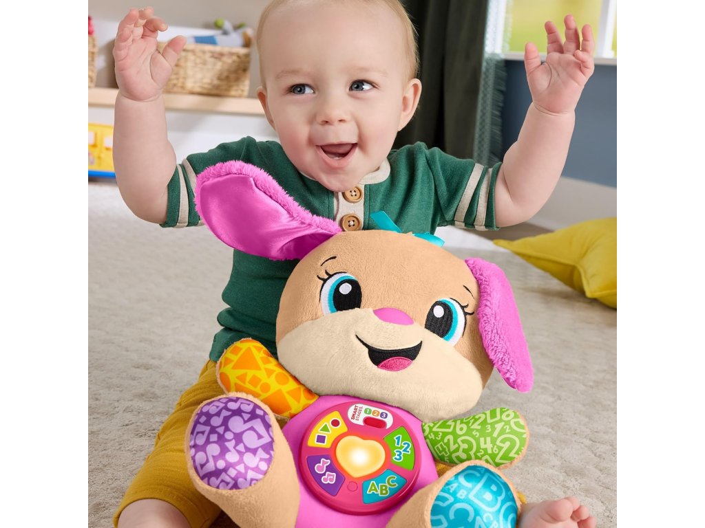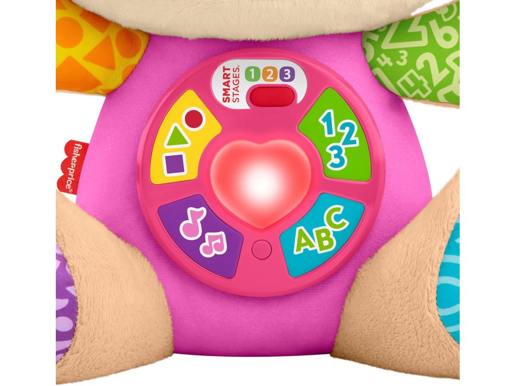 Mluvící pejskova sestřička Smart Stages® z řady Fisher-Price® Směj se a Poznávej!® je příjemná plyšová hudební hračka, která seznamuje dítě s abecedou, tvary, prvními slovy a dalšími prvky! Děti mohou stisknout 5 tlačítek na bříšku a sledovat, jak se její srdíčko rozsvěcuje barvami, zatímco hraje více než 80 písniček, zvuků a frází. Díky více než 12 originálním písničkám a 3 úrovním učení Smart Stages®, které rostou spolu s dítětem od kojence až po batole, se Mluvící pejskova sestřička stane nejlepší kamarádkou vašeho děťátka.