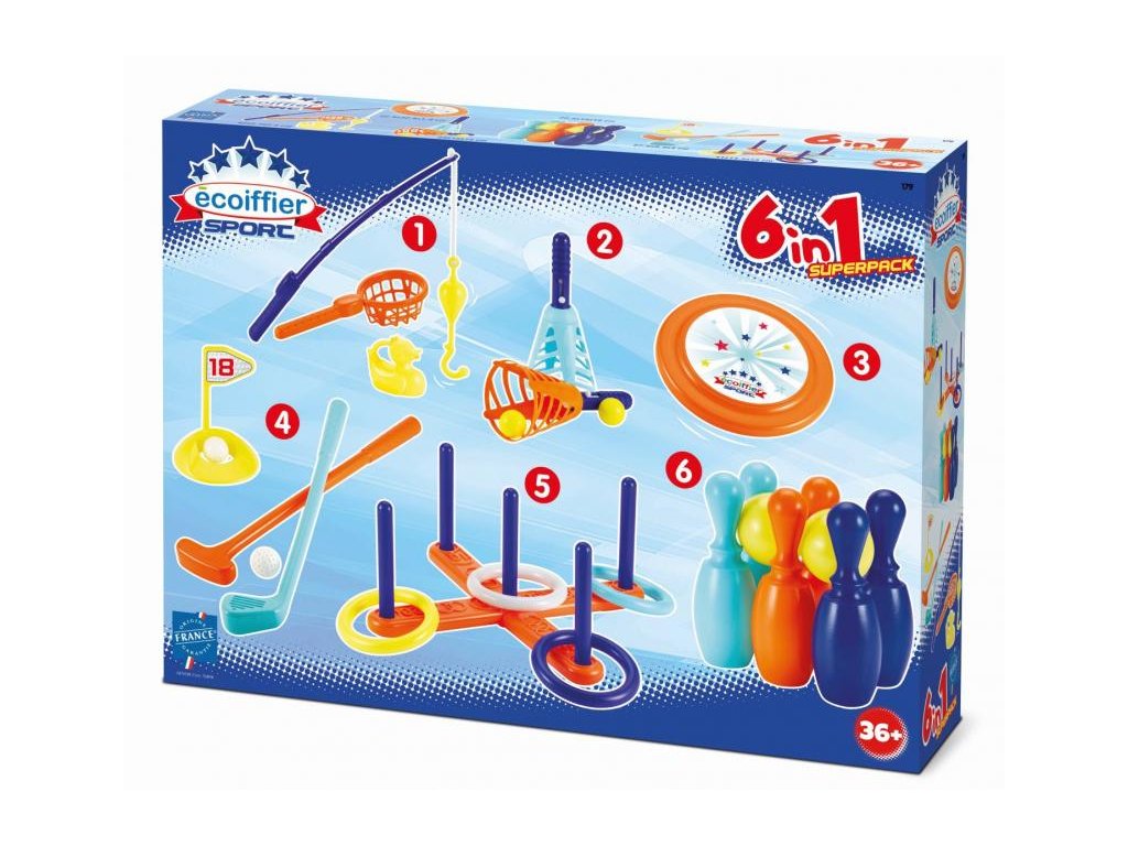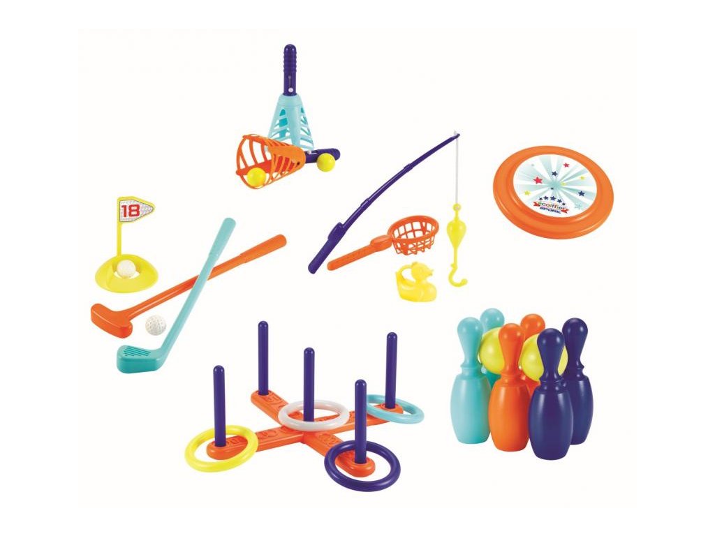 Sada 6 her vhodných do interiéru i exteriéru - frisbee, chytání rybiček, golf, chyť míček, kroužky na kříž a kuželky.
