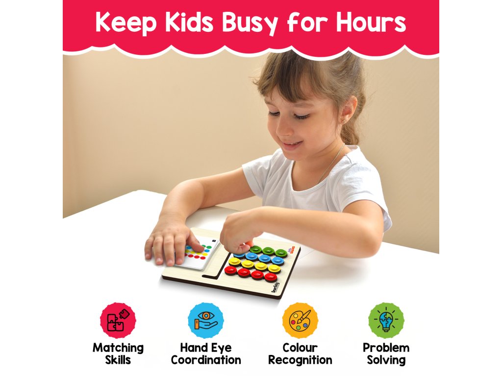Toto barevné puzzle vyžaduje, aby dítě replikovalo barevné vzory dle 15ti přiložených karet s úkoly ve třech úrovních obtížnosti.